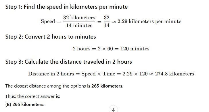 A train covers 32 kilometers in 14. If it continues to travel at the same rate, which of the following is closest to the distance it will travel in 2 hours...? Mcqs