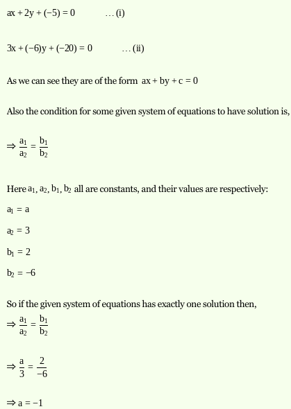 ax + 2y = 5 3x - 6y = 20 In the system of above, a is a constant if the system has one solution, which of the following CANNOT be the value of a...? Mcqs